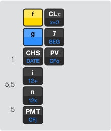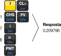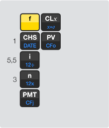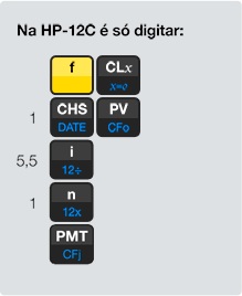 Para calcular o coeficiente de uma compra para a qual você não sabe o valor presente (PV), na calculadora basta inserir o número 1 em seu lugar. Acompanhe o exemplo com uma taxa de juros de 5,5% a.m.