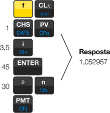 3) Qual coeficiente utilizado por uma loja para pagamento em cheque de 45 dias à taxa de 3,5% a.m.?