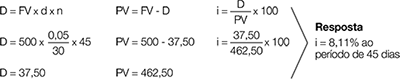 3) Um cliente foi ao banco descontar uma duplicata de R$ 500. Como o título vence daqui a 45 dias e a taxa de desconto é de 5% a.m., qual é a taxa de juros (i)?