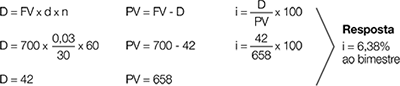 4) Uma duplicata no valor de R$ 700, com vencimento para 60 dias, foi descontada à taxa de 3% a.m. Calcule sua taxa de juros (i).