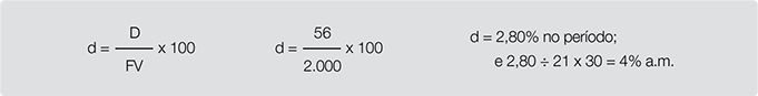 Uma duplicata no valor de R$ 2.000 foi descontada 21 dias antes do seu vencimento, e a taxa de desconto cobrada pelo banco foi de 4% a.m. Aprenda a calcular o valor do desconto: